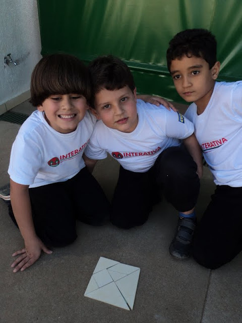 Tangram é um quebra-cabeça chinês formado por 5 triângulos, 1 quadrado e 1 paralelogramo. A professora do 3º Período, Érica Anchieta, levou o Tangram para os alunos conhecerem e propôs uma atividade diferente. Com essas peças pode-se formar várias figuras, utilizando todas elas sem sobrepô-las. Foi uma atividade muito divertida.