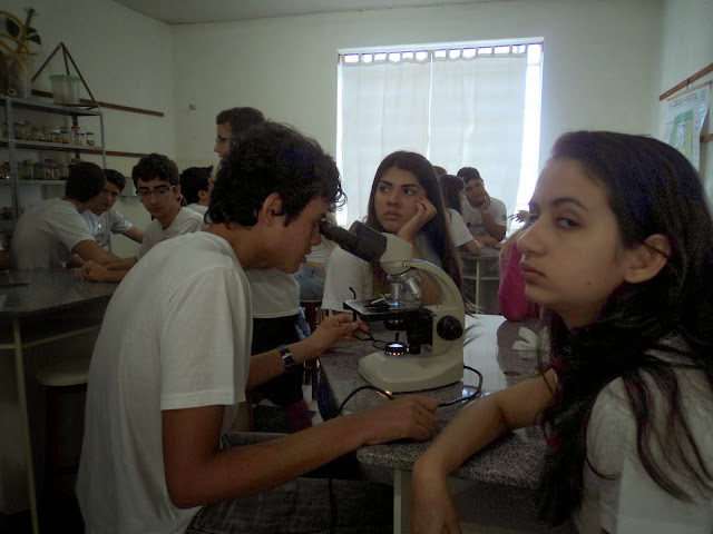 Aula sobre a fermentação no Laboratório de Ciências com os alunos da 3ª série do Ensino Médio: “A proposta da atividade foi observar a fermentação alcoólica. Fermentação é um processo anaeróbico de obtenção de energia. O fermento biológico utilizado para fazer pão contém um fungo que realiza a fermentação alcoólica, onde observamos a liberação de dióxido de carbono. É este gás que faz a massa crescer.” Profª de Biologia, Isabella R. Valle Dias