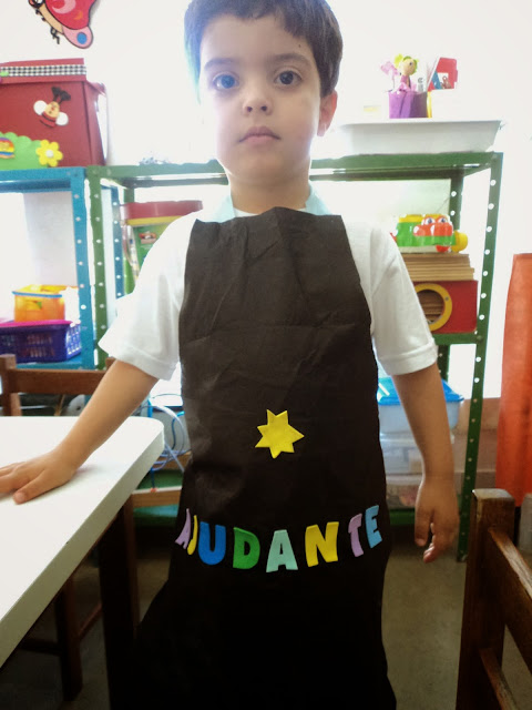 Os ajudantes do 1º Período, da professora Helen S. Charavallote, estão felizes por contribuir nas funções que a professora solicita. Agora têm mais motivos para se alegrarem, o ajudante agora te o “avental de ajudante”. Que felicidades nesses rostinhos!