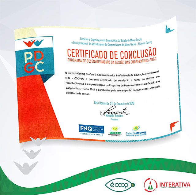 A Coopeg – Cooperativa dos Profissionais de Educação em Guaxupé, mantenedora da Escola Interativa recebeu no início de março deste ano, o certificado de conclusão e honra ao mérito em reconhecimento à sua participação no Programa de Gestão das Cooperativas (PDGC) – Ciclo 2017. O certificado de conclusão foi entregue pela Ocemg (Organização das Cooperativas …