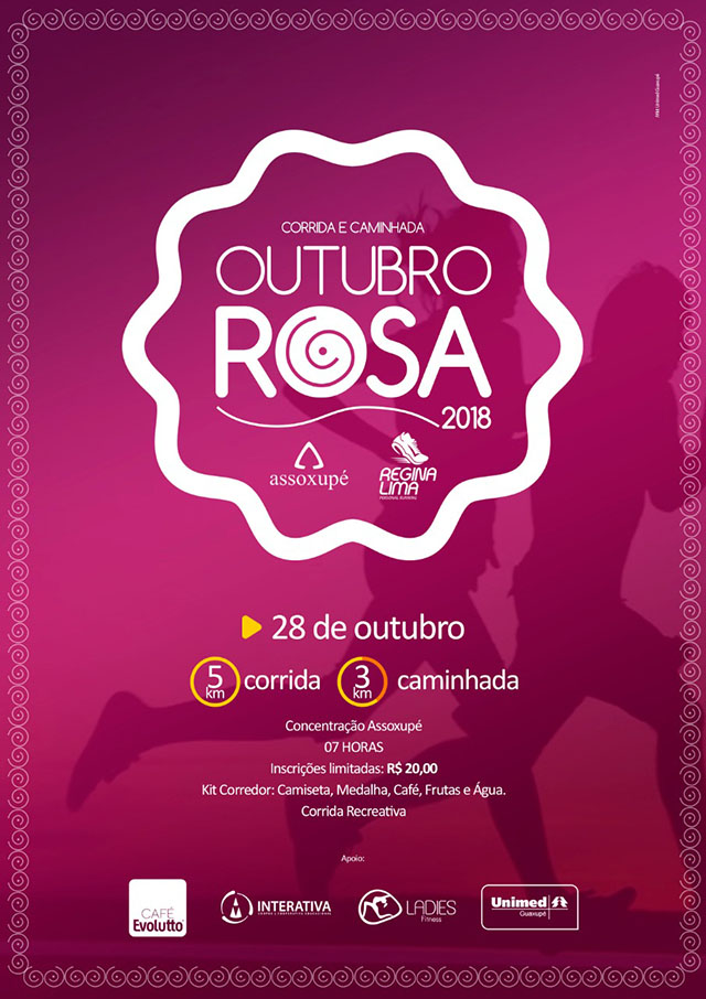 A cooperada / professora Regina Lima, em conscientização ao Outubro Rosa – Prevenção e Diagnóstico Precoce do Câncer de Mama, em parceira com a Assoxupé organizou uma corrida e caminhada que acontecerá no dia 28 de outubro. As inscrições podem ser feitas diretamente com a professora Regina ou nas secretarias da escola. Apoio: Coopeg / Interativa …