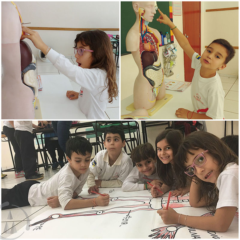 Durante os estudos de ciências sobre o corpo humano, os alunos trabalharam a noção do esquema corporal, a sustentação do corpo – esqueleto, o movimento – músculos e os órgãos. O trabalho foi enriquecido com diversas atividades lúdicas.