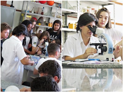 Alunos do 1º EM tiveram uma aula prática na matéria de Biologia no estudo das células. No laboratório os alunos identificaram no microscópio células sanguíneas (hemácias), células da boca, dentre outras estruturas, como a do fio de cabelo, etc.