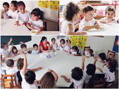 A professora Rosana Martins e os alunos do 1º Período I fizeram uma deliciosa salada de frutas para trabalhar a questão dos diferentes sabores, cores, formatos das frutas e estimulando também uma alimentação saudável.