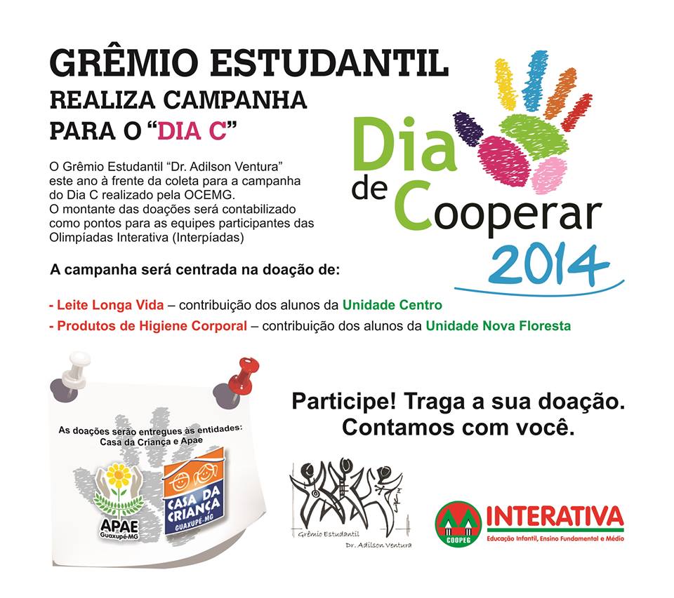 O Grêmio Estudantil “Dr. Adilson Ventura” este ano à frente da coleta para a campanha do Dia C idealizado pela OCEMG. A campanha será centrada na doação de: Leite Longa Vida – contribuição dos alunos da Unidade Centro Produtos de Higiene Corporal – contribuição dos alunos da Unidade Nova Floresta As doações serão entregues às entidades: …