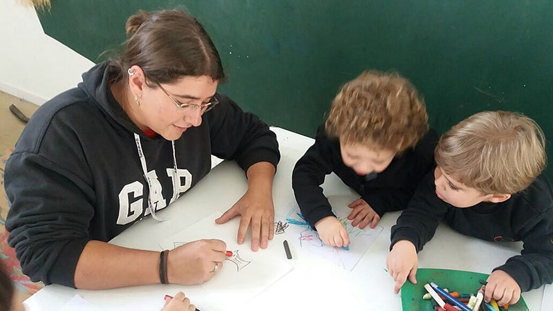 Elaine Spinelli, Engenheira Agrônoma, formada pelo Instituto Federal Minas Gerais campus Bambuí e ex aluna, auxilia o Maternal II da professora Ana Carolyna no desenho de uma Calopsita , ouvindo sugestões de cores e formas.