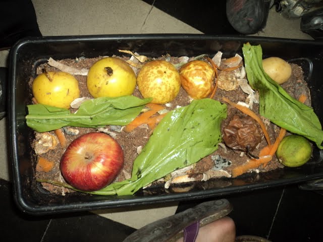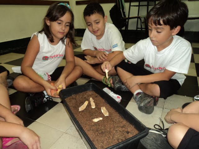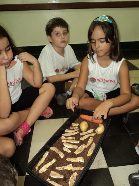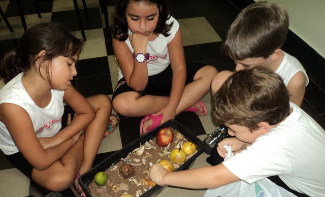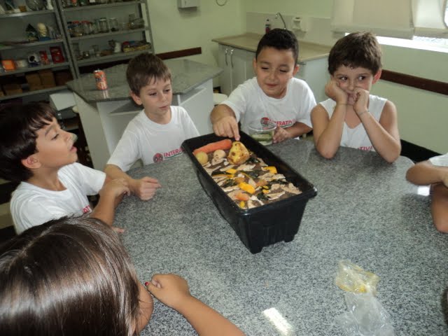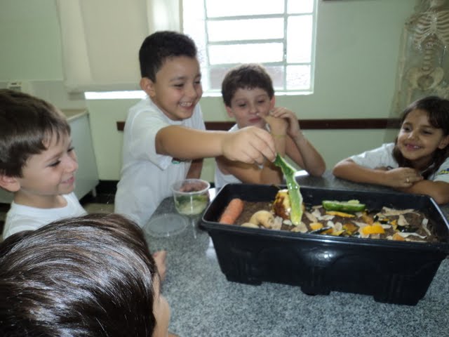 Para que os alunos do 2º ano percebessem e descobrissem a importância dos fungos e das bactérias para o processo de decomposição, a professora Sueli Barros organizou uma experiência no Laboratório de Ciências. Os alunos deixaram os alimentos expostos em um recipiente ao ar livre, e depois de um determinado tempo, compararam aspectos físicos dos mesmos. A professora instiga os alunos para que possam elaborar hipóteses, organizar ideias e discutir o processo de decomposição. No final, fazem um registro coletivo a partir das análises realizadas no Laboratório.