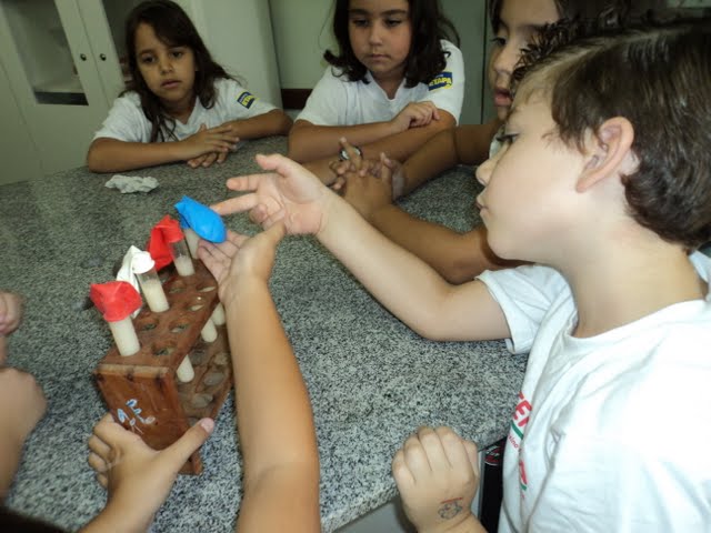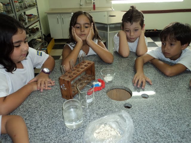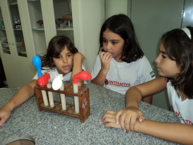 Nos trabalhos de Ciências, do segundo ano da professora Sueli Barros, mais uma experiência foi realizada em laboratório de Química. As crianças usaram uma mistura de água morna, açúcar e fermento, que ao reagir formou-se gás. Com o aumento da pressão dentro do recipiente, o ar expande e o balão enche. O balão enche mais se usarmos um recipiente menor. Ao fazer um bolo, o fermento funciona de forma semelhante, formam-se bolhas e o bolo cresce.