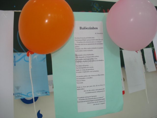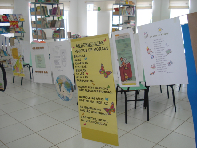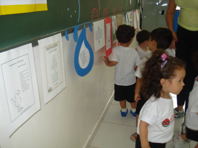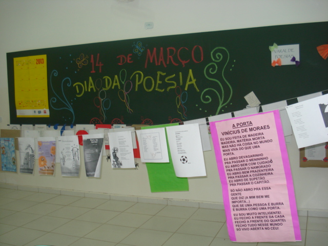 Para comemorar o dia da poesia, a bibliotecária da escola Renata de Siqueira preparou um varal com muitas poesias; com rima, sem rima, anagramas, entre outras. Elias José, Vinícius de Moraes, Sidónio Muralha, Cecília Meireles, Tatiana Belinky, José Paulo Paes, Mário Quintana, Fernando Paixão, encantam as crianças com suas poesias e alegram a nossa vida. A poesia deve fazer parte do cotidiano escolar como uma linguagem direta com o leitor. Poesia é arte que estimula a criatividade e a liberdade de pensamento. Os professores levaram seus alunos até a biblioteca para um exercício poético. Cada poesia fala diretamente com o aluno sem precisar de mais nada.