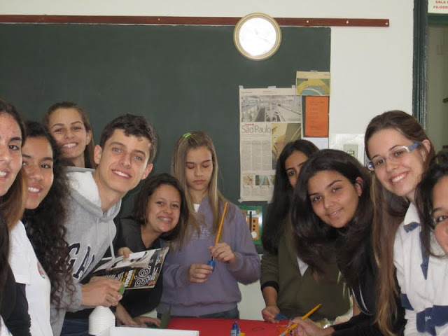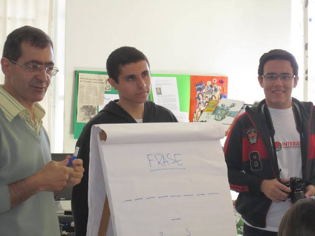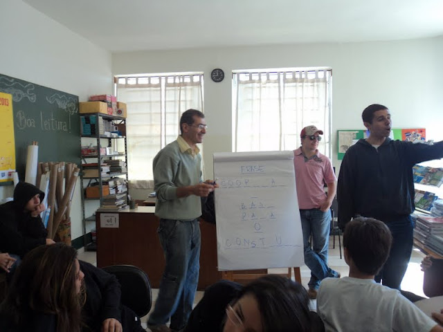 Frase do enigma resolvida pelo grupo que trabalhou na Biblioteca: Cooperar é base do construir. (Amador 2º EM e professor Luiz Smaira)