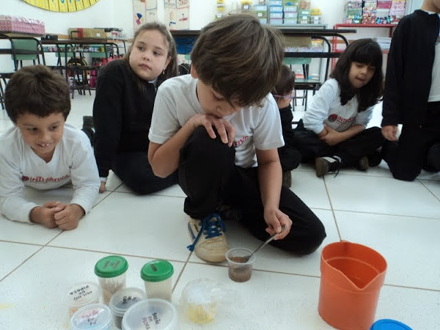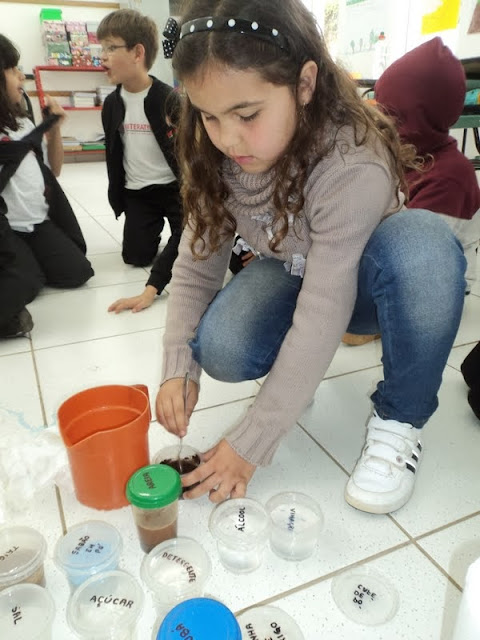 Os alunos do 1º ano, da professora Veridiana, já sabem que na natureza encontramos diversos tipos de água e dificilmente a encontramos pura. Isto porque, na água, estão dissolvidas várias outras substâncias. Em experiência em sala de aula observaram que a água é um ótimo solvente, ou seja, dissolve muitas outras substâncias.