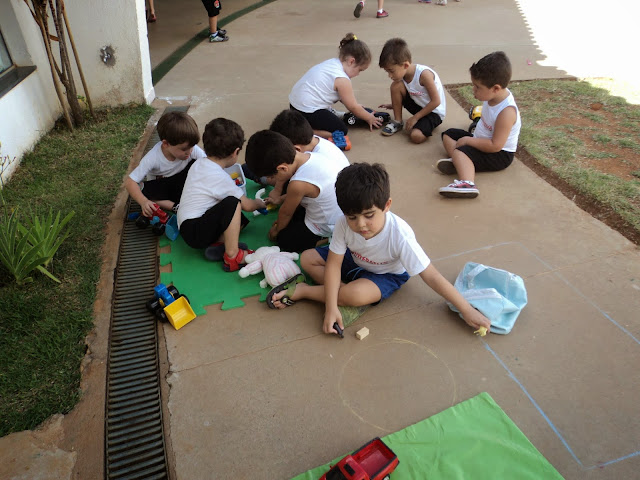 Depois de muitas atividades em sala, a professora do 1º Período, Helen Silva Charavallote, leva os brinquedos e o tatame para fora da sala, é hora de brincar com os amiguinhos.