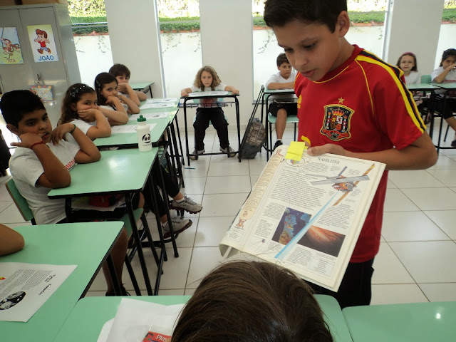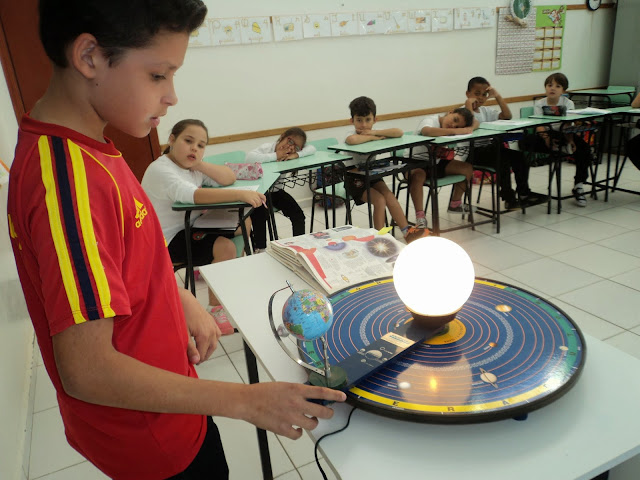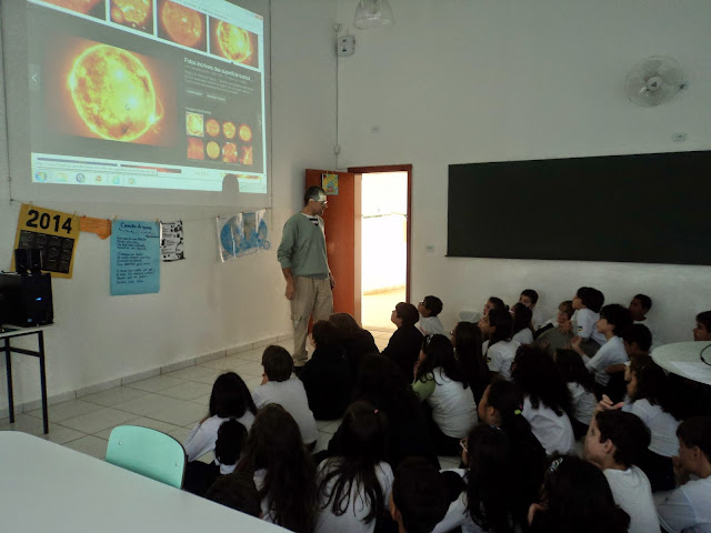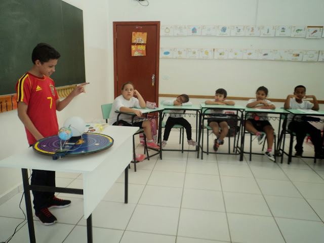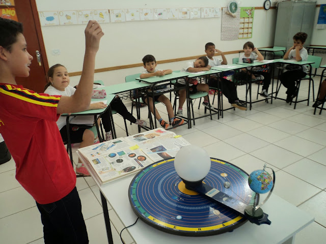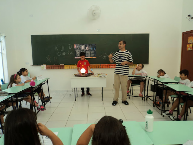 Para complementar as aulas de Ciências, os alunos do 2º ano receberam na sala, o aluno Matheus Custódio (6º ano) para uma aula sobre os astros. Matheus explicou à turma seus conhecimentos sobre o planetas, estrelas, satélite e galáxias. E também, Luiz Smaira, professor de física e matemática, deu uma aula sobre o sistema solar para os alunos Fundamental I, do período da manhã.