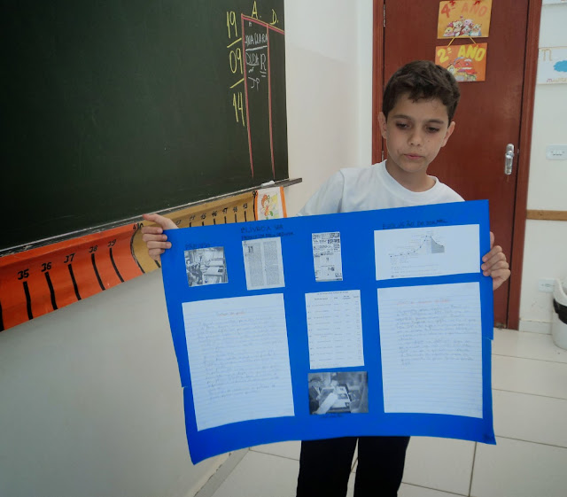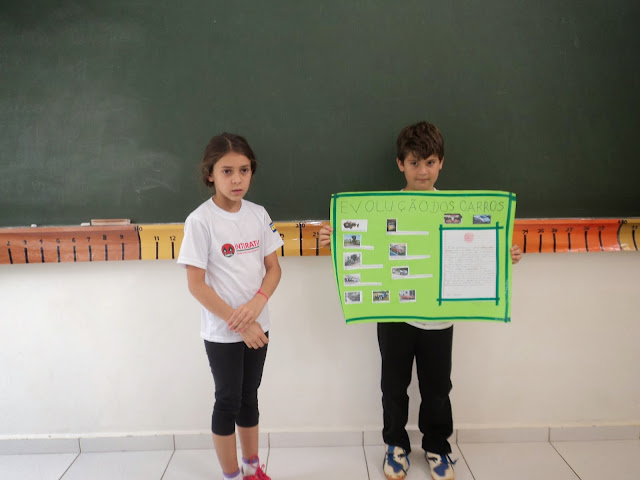 Os alunos do 4º ano estudaram no conteúdo de Geografia os meios de transporte e os meios de comunicação, com a professora Silvia Helena. Após a leitura em sala, fizeram um estudo mais aprofundado e registraram em cartazes a evolução dos meios de comunicação e dos meios de transporte. Este trabalho de pesquisa em jornais, revistas e internet acrescenta conhecimento sobre o assunto e cada criança reconhece características quanto ao uso destes meios, disponíveis no mundo atual e sua utilização no passado.
