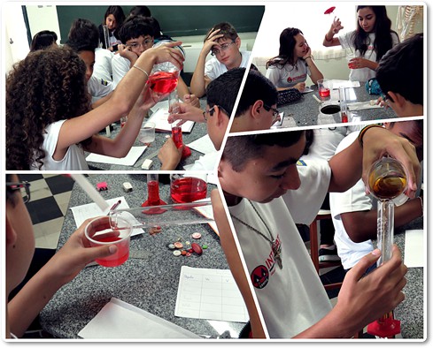 A professora de Física e Química Jaqueline da Silva Quintino, levou os alunos do 7º ano ao laboratório onde fizeram experimentos sobre volumes, a matéria em questão foi corpos irregulares.