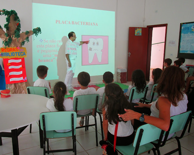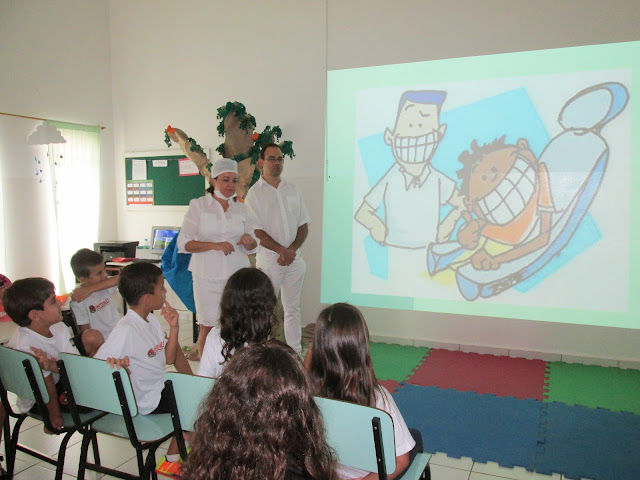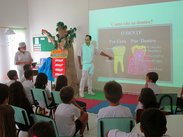 Alunos do 2º ano do Fundamental I, da professora Sueli Barros, aprenderam alguns cuidados pessoais para uma boa higiene bucal, nas aulas de Ciências. A higiene bucal é necessária para todas as pessoas manterem a saúde de seus dentes e boca e é considerada a melhor forma de prevenção de cáries e outros problemas na boca, além de ajudar a prevenir o mau-hálito (halitose). Este trabalho desenvolvido em sala tem como objetivo fazer que as crianças entendam as funções do dente e conheçam as doenças bucais como a cárie. A professora demonstrou como proceder uma escovação correta dos dentes e orientou-os a consultar o dentista regularmente e comentou sobre o uso do fio dental. E no final do trabalho os alunos assistiram uma palestra sobre orientação odontológica com profissionais da área. Os pais do aluno Felipe Prado, o cirurgião dentista Dr. Regis Costa Teixeira e Ana Cristina vieram conversar com a turma e esclareceram muitas dúvidas dos alunos.