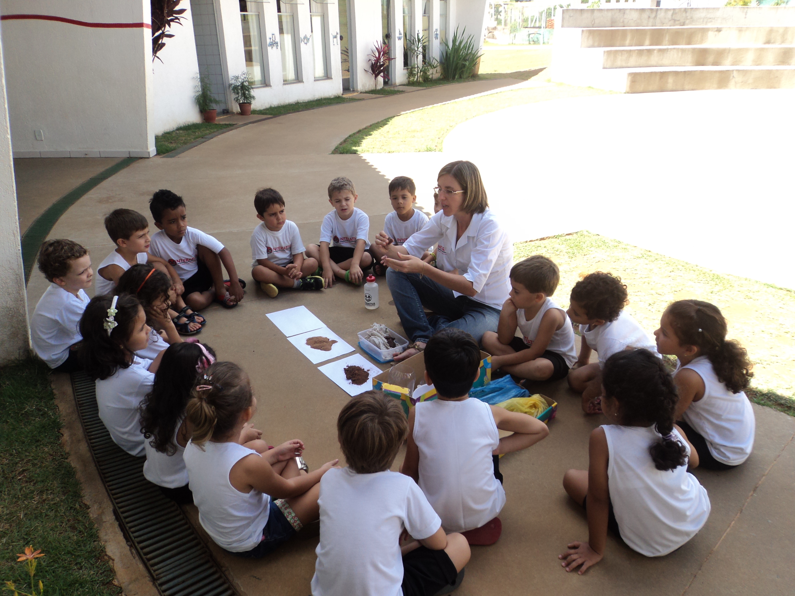 A professora do 2º Período, Cássia S. Silva Pires, colocou tipos de solo para que as crianças visualizassem, com o objetivo de desenvolver as primeiras noções sobre solo. E continuando o projeto, as crianças compreendem a importância de cuidar do solo.