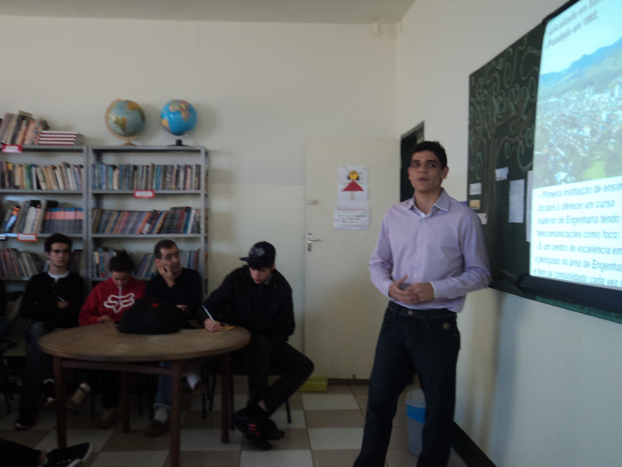 O Instituto Nacional de Telecomunicações – Inatel desenvolve o projetro “Promove Engenharia” que realiza palestras nas escolas divulgando os cursos que ele oferece. A visita do engenheiro Josias Amós aconteceu no dia 02 de setembro na biblioteca da escola com alunos da 2ª e 3ª série do Ensino Médio.