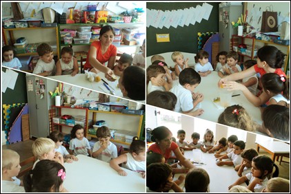 A turma do 1º Período, da professora Rosana, já estudou muitas coisas interessantes em sala. As fotos são da hora da rodinha, onde estão com as fichas dos nomes e na área livre (fora da sala) estão interagindo em outra brincadeira.