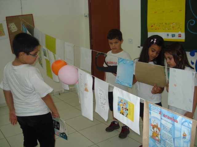 A turma do Período Interativo têm horário reservado na biblioteca da escola. A bibliotecária Renata conta uma história e depois acontece uma “mini oficina”, onde confecciona-se o personagem da história. A cada quinze dias acontece essa atividade com materiais reciclados e o aluno dá seu toque com desenho, pintura e colagem.