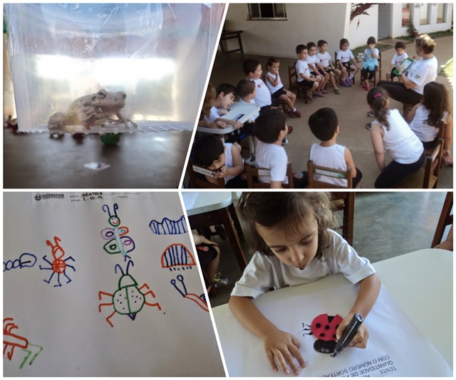 O 1º Período trabalha com o Projeto Bichos de Jardim. Estudam os insetos que vivem no jardim, borboleta, joaninhas, grilo, formigas, lesma, rã. Rã? Lida a história “Bichos de jardim” de Ana Michaellis – Editora Callis, estudam insetos dos vários jardins que a escola possui e depois registram em sala os insetos. 1º Período (professora Rosana): 1º …