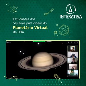 Estudantes dos 5ºs anos da Escola Interativa, participaram de uma sessão do Planetário virtual da OBA. No evento, duas planetaristas apresentaram e tiraram dúvidas dos participantes sobre formação das estrelas, identificação das constelações no céu e características e curiosidades sobre os planetas do sistema solar.