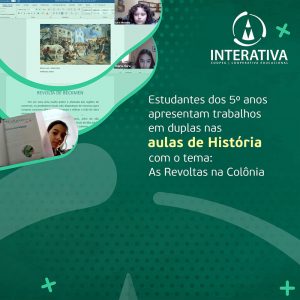 Os estudantes dos 5º anos da Escola Interativa, durante aula online tiveram a oportunidade de expor oralmente trabalhos realizados em duplas, na área de História, sobre o tema: As Revoltas na Colônia; podendo assim exercer a capacidade de articular entre a fala e o uso de roteiro planejado a apresentação de seus trabalhos.
