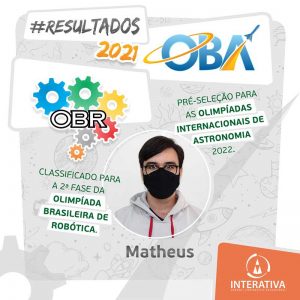 O estudante Matheus Paulinho Ribeiro, da 3ª série do ensino médio, foi selecionado para o processo que escolherá os representantes que irão compor as equipes brasileiras que participarão das Olimpíadas Internacionais de Astronomia de 2022. Matheus também garantiu sua participação para a 2ª fase da Olimpíada Brasileira de Robótica.